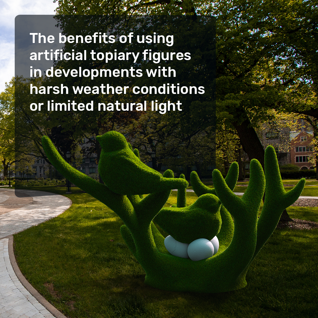 Developments with harsh weather conditions or limited natural light can make it challenging to maintain live plants and greenery. Artificial topiary figures offer several benefits in such environments, including: